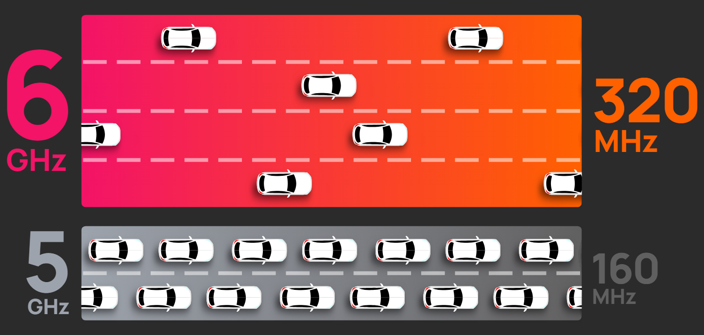 So sánh băng tần 6GHz (của Wi-Fi 7) với băng 5GHz (của Wi-Fi 6) thông qua việc mô tả lưu lượng xe cộ trên đường
